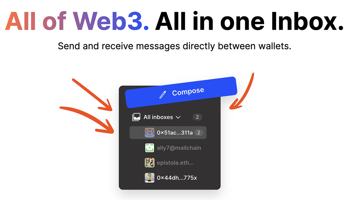 Mailchain is the new communication layer for Web3. With one simple, elegant inbox, users can send and receive private messages using public blockchain addresses. Teams and individuals can receive notifications about their on-chain activity and communicate with any identity, on any protocol. Projects, DAOs, exchanges and protocols integrating Mailchain can directly communicate with their users, wallet-to-wallet.